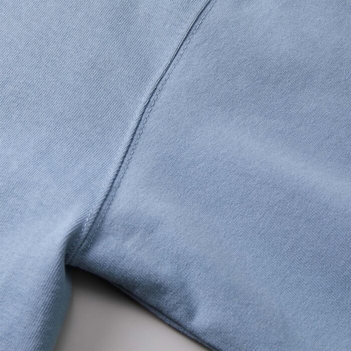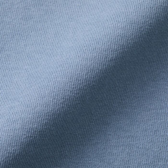 シャリ感のあるオープンエンド双糸を極厚に編み立てた生地は、ドライでタフな質感が魅力。
